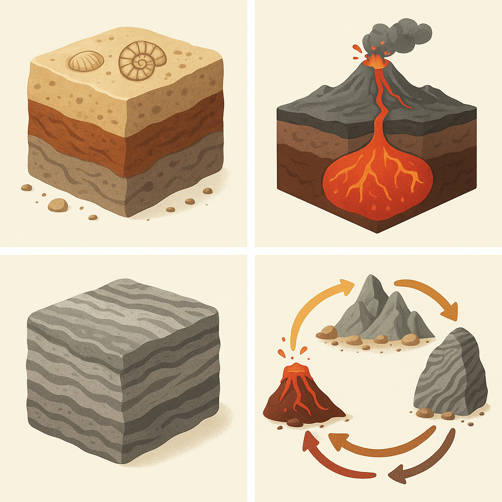 | 변성암 | 열과 압력 | 지각 심부 | 엽리 구조, 광물 재배열 |